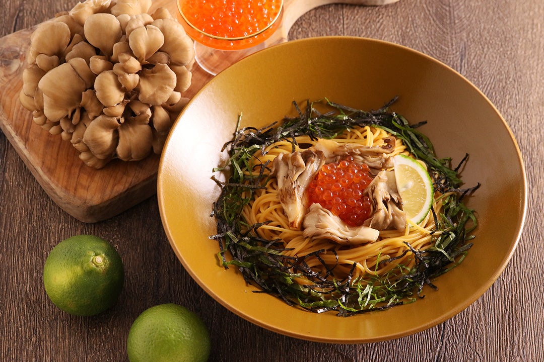 プチッと弾けるいくらをたっぷりのせたパスタは1日10食限定!食欲をそそる醤油バターの香りに、舞茸で秋らしい一皿。