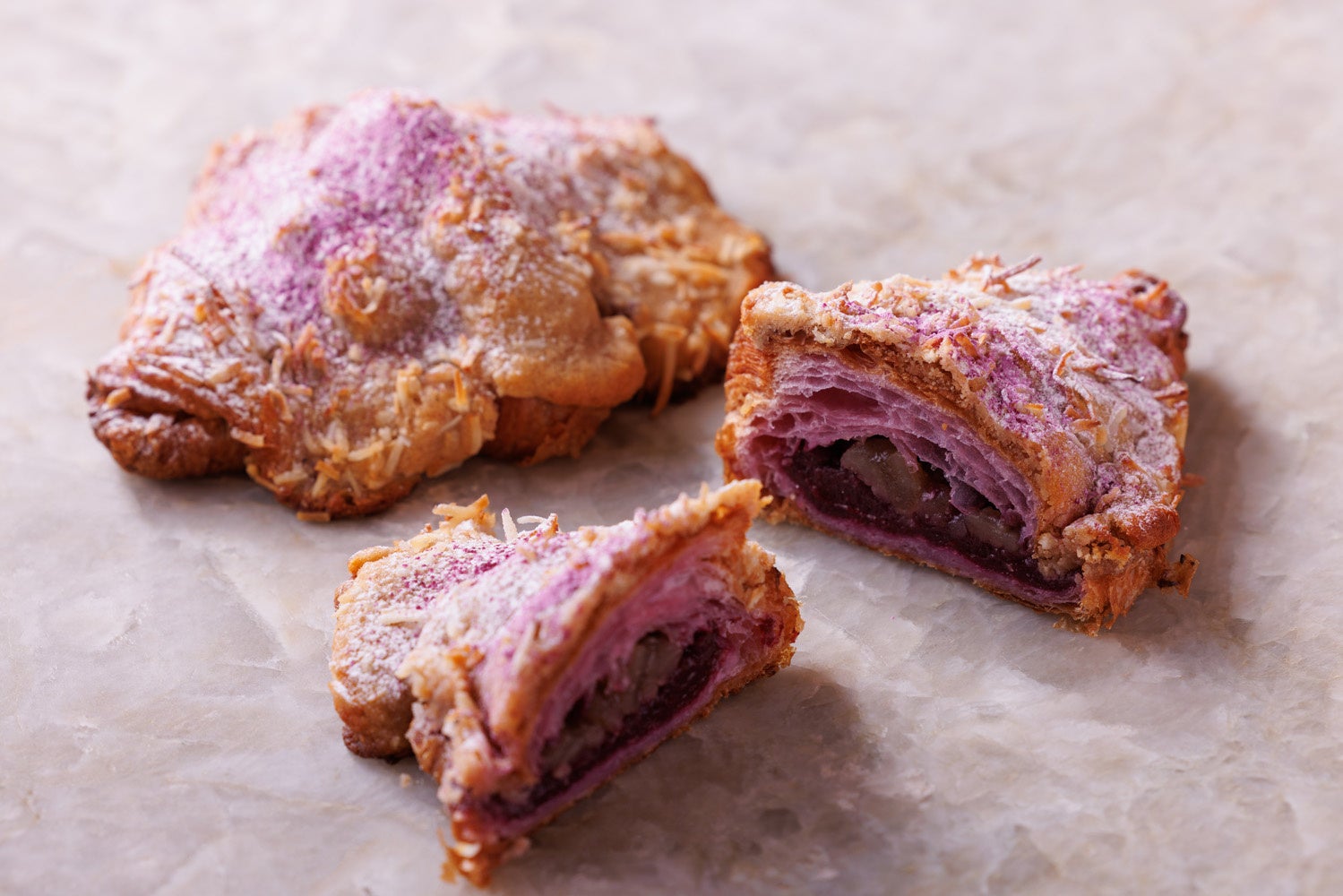 紫芋を練り込んだ色鮮やかな紫色のクロワッサンに、カシスと栗をたっぷりと挟み甘酸っぱさと栗の風味を閉じ込めました。マロン風味のアーモンド生地を絞り焼き上げた香り豊かなクロワッサンダマンドは紫芋のパウダーで色鮮やかに仕上げました。