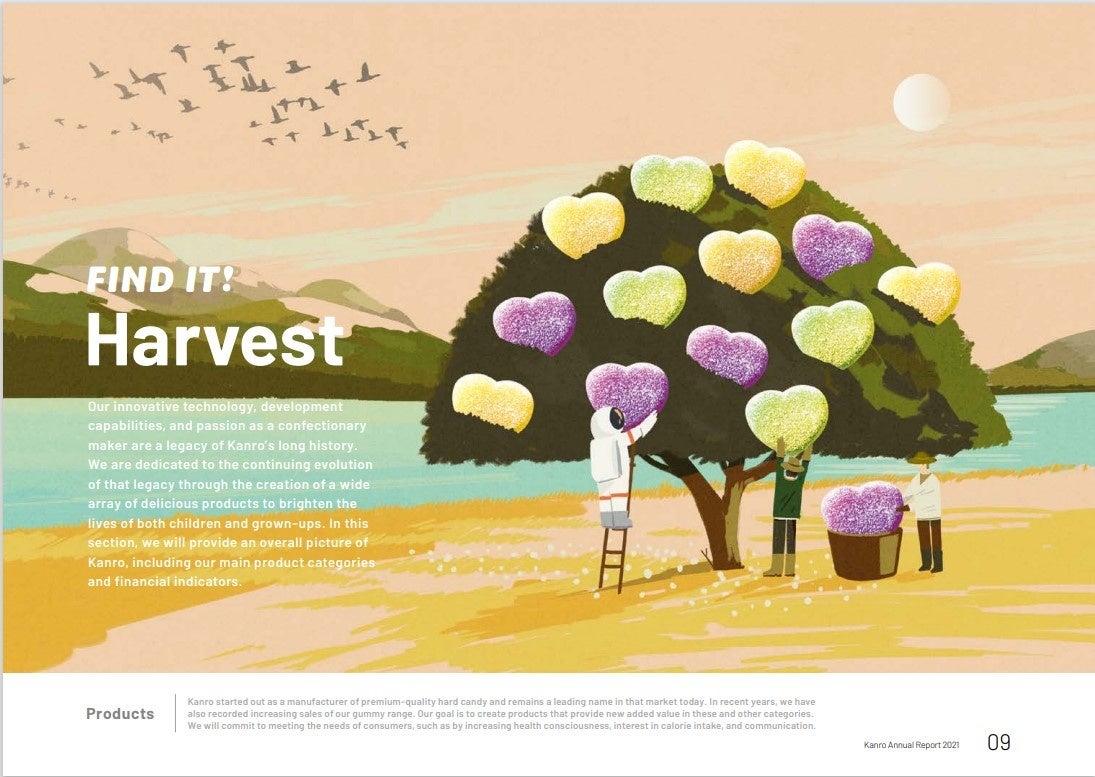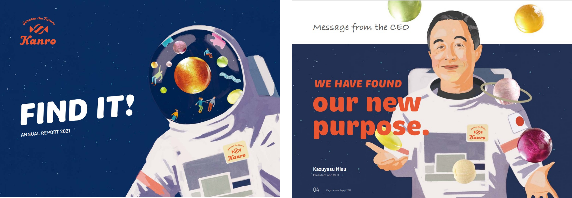 「アニュアルレポート 2021」(英語版)は、2022年2月に発表した「中期経営計画2024」(2022年~2024年度)で述べているように、カンロの原点であり強みである国内コア事業だけでなく、グローバル/デジタルコマース/フューチャーデザイン事業、それぞれの事業領域の拡大を未知の世界への挑戦・開拓と捉え、その世界観を宇宙で表現しています。また、世界的に活躍されているイタリア人イラストレーター ファビオ・コンソーリ氏のイラストを採用し、親近感ある仕上がりにしています。絵本のような装丁になっており、気軽に手に取って頂きたい、という想いを込めました。