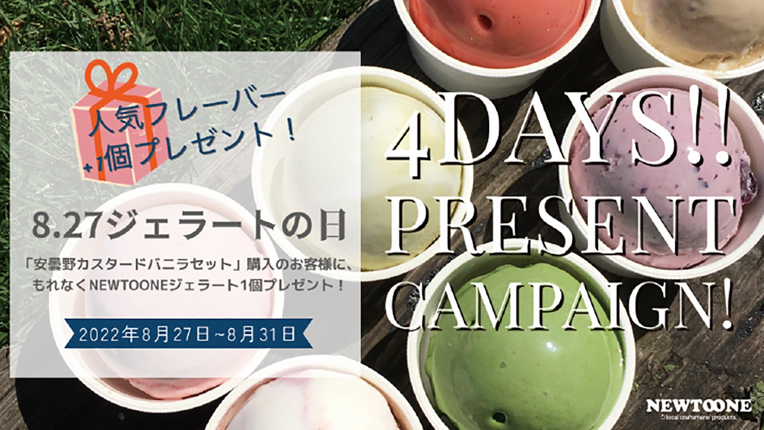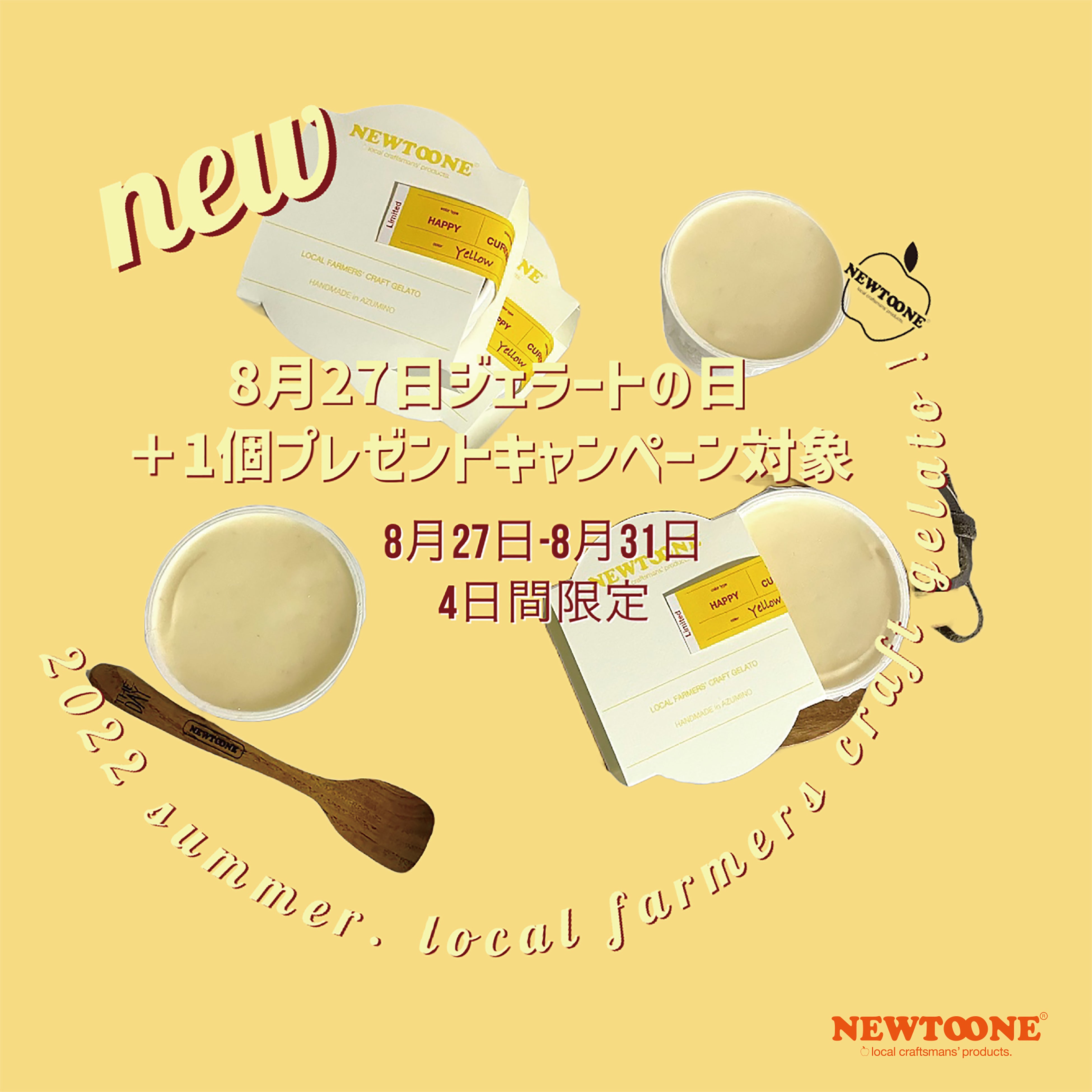 信州のご縁をつないで誕生したクラフトプロダクトを全国にお届けするオンラインストア < NEWTOONE https://newtoone.store/ > を運営する合同会社GOEN(本社:長野県松本市、代表:今井洋一)は、8月27日の「ジェラートの日」にあわせて、8/27〜8/31の4日間『プラスワンキャンペーン』を実施いたします。