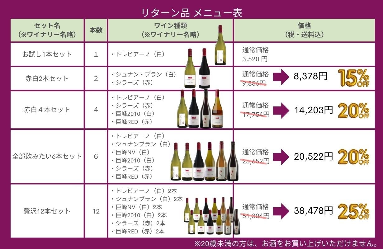 Makuakeだけの限定先行販売のシュナンブラン 2014年、トレビアーノ 2018年、シラーズ2012年、そして巨峰ワイン3種を含む、プランをご用意させていただきました。(各750ml)