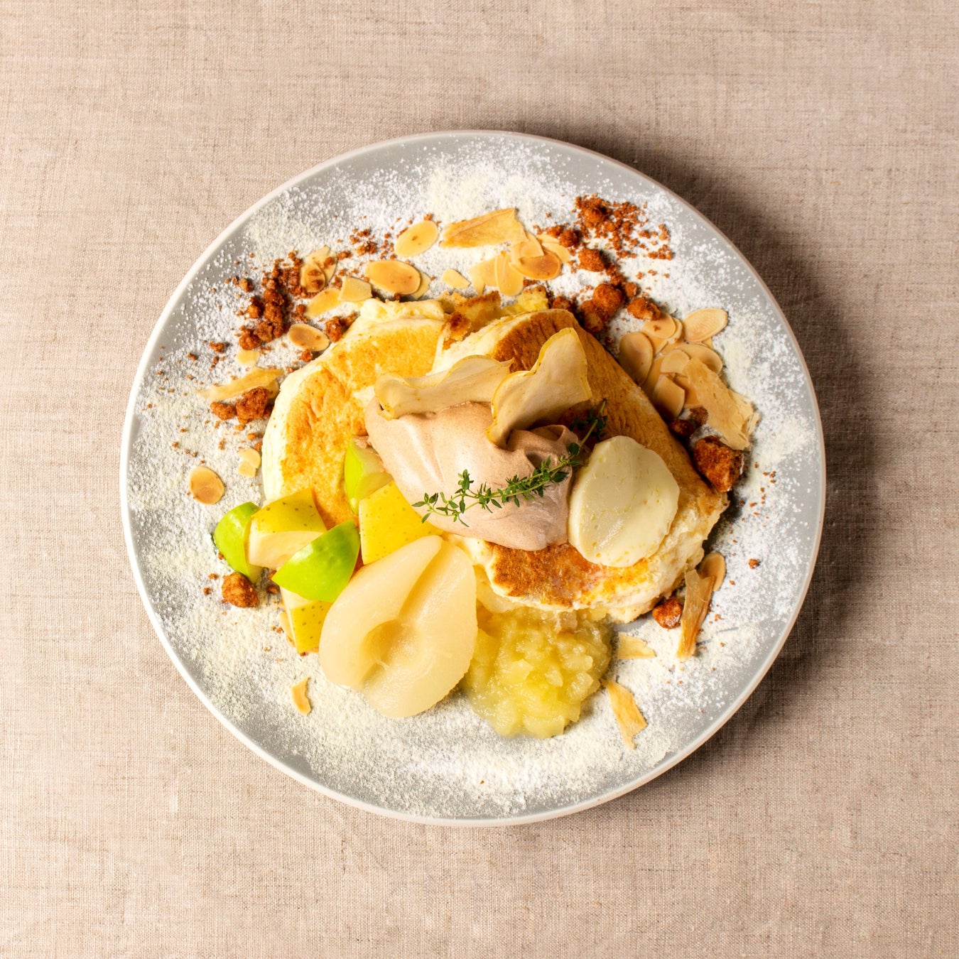 スパイスとフルーツが優しく香る大人なパンケーキです。ジンジャーがアクセントのラフランスコンポートや瑞々しいグラニースミスは晩秋のお楽しみ。軽い甘さのジンジャークリームとあわせてさっぱりお楽しみいただけます。