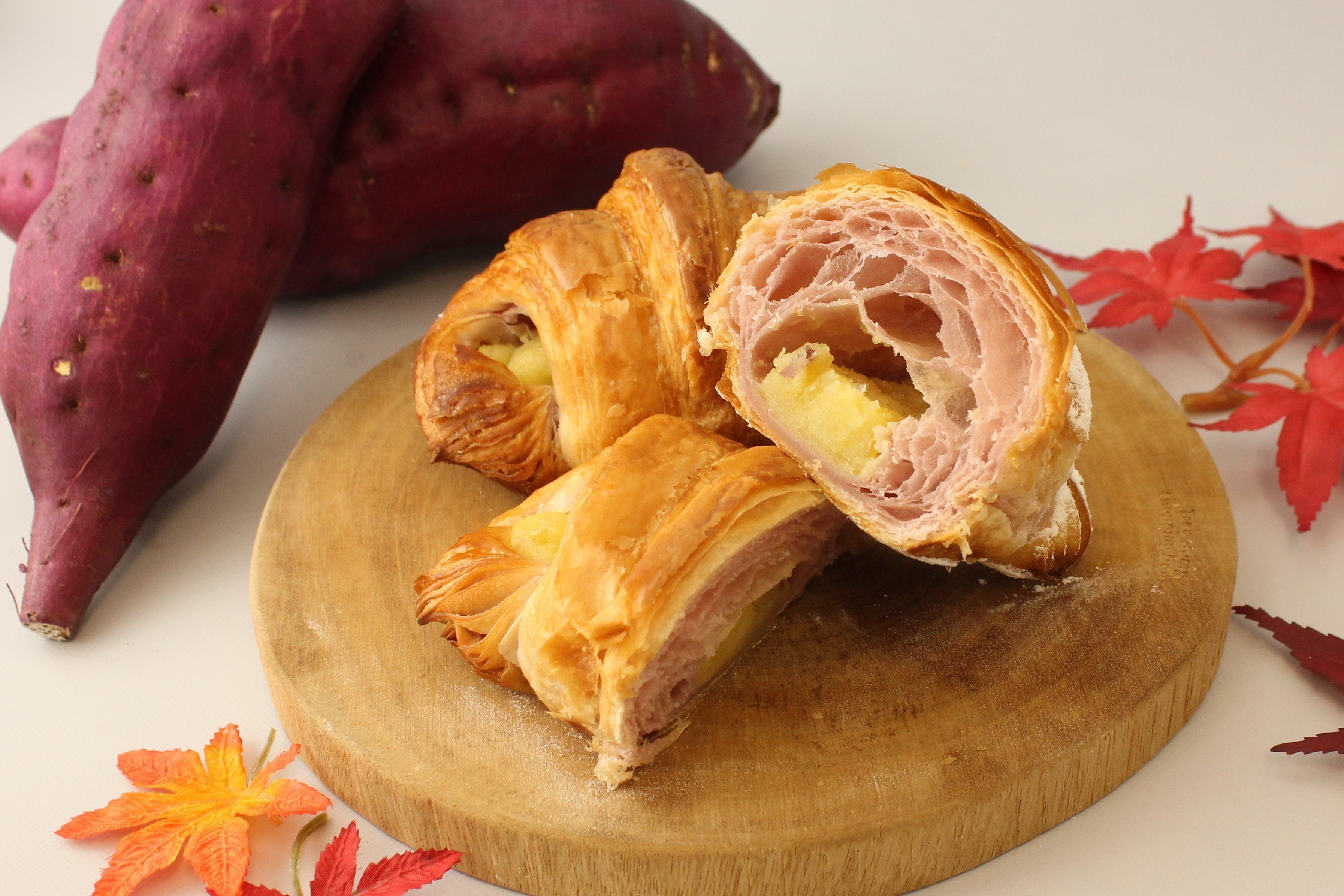 鹿児島県産紫芋ペーストを使用したデニッシュ生地に、紅はるか芋のスイートポテトを包み焼き上げました。秋に欠かせない味覚さつまいもをふんだんに使った、色鮮やかなクロワッサン。なめらかで濃厚なスイートポテトと軽い食感のデニッシュは、みんな大好きな組み合わせ。この秋の定番に、ぜひ。