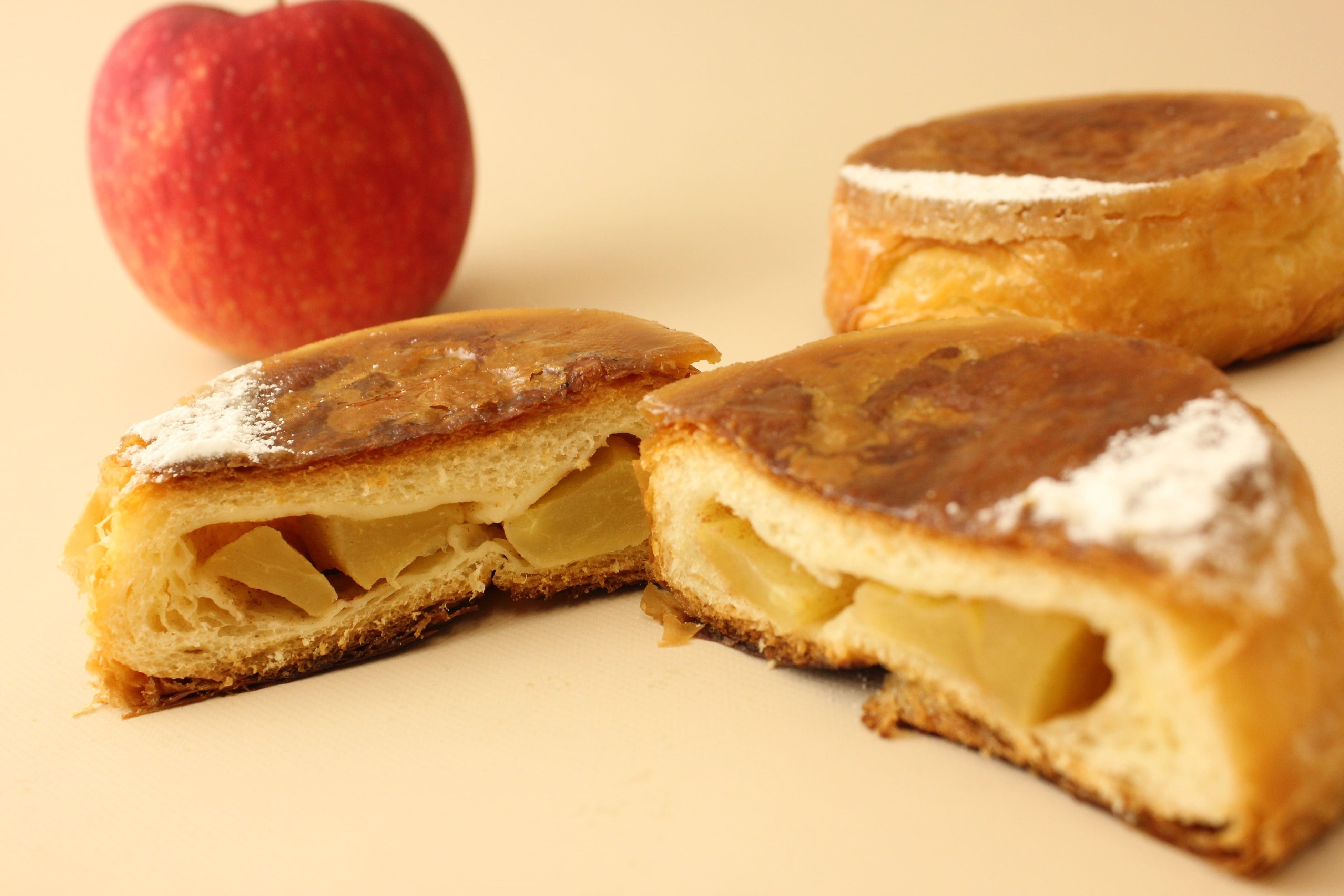 デニッシュ生地に国産りんごとシナモンを包んで焼き上げました。クイニーアマンのように、バターとグラニュー糖をつけてカリカリサクサクに焼かれた表面の香ばしさが特徴的。りんごの爽やかな酸味とも相性抜群です。