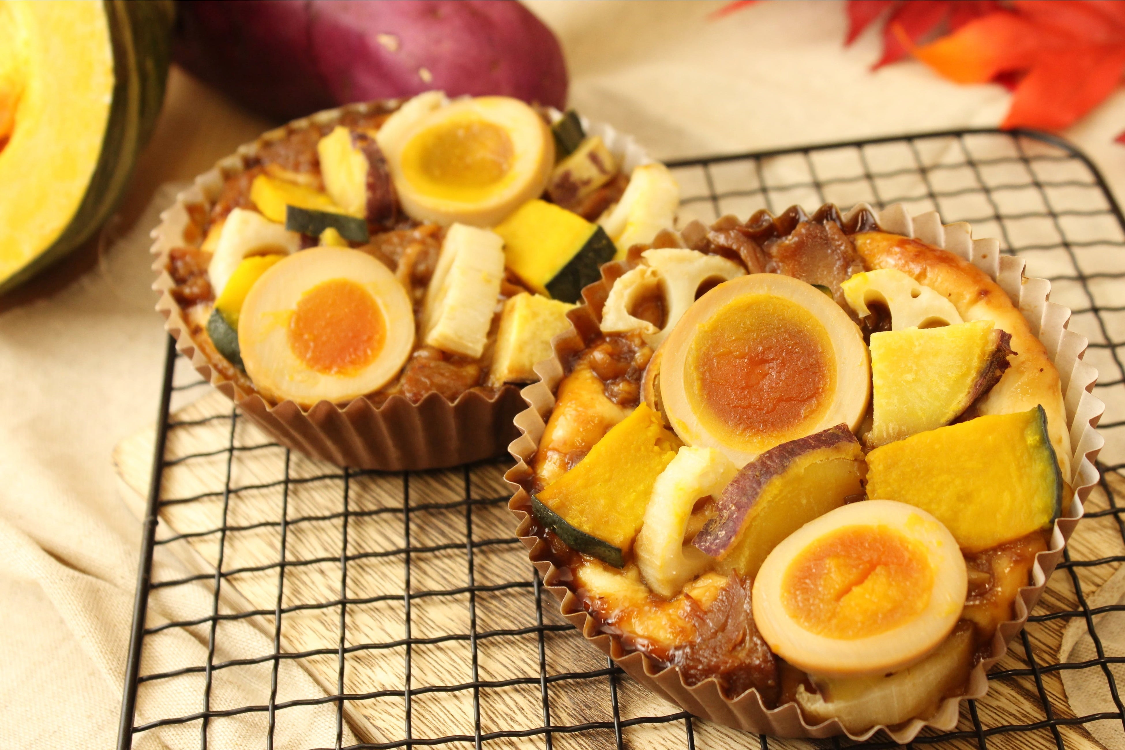 照り焼きチキンと、秋野菜のかぼちゃ・さつまいも・れんこんを贅沢にトッピングしました。パン生地が隠れるほど大きくカットされた食材の存在感に思わずビックリ!ボリュームたっぷりの野菜の食感をお楽しみください。