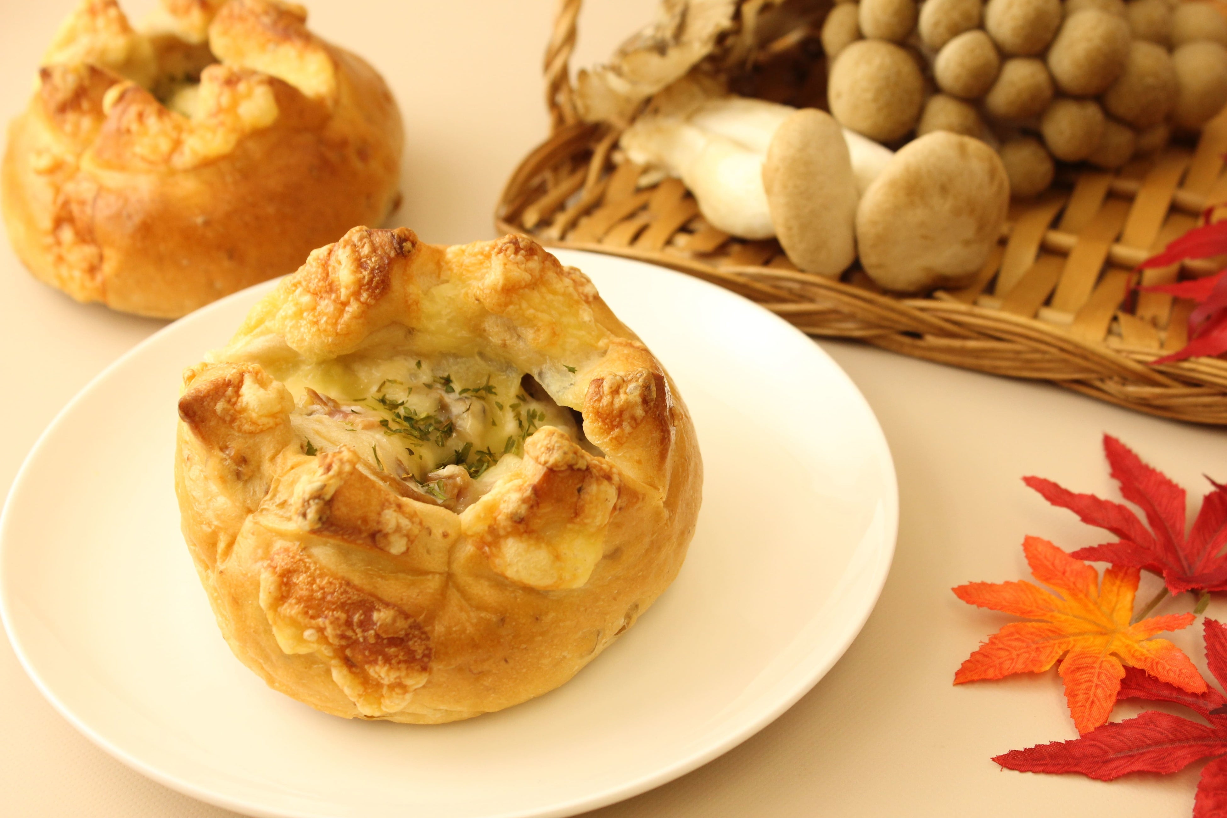 くるみ入りの生地にまいたけ、エリンギ、ぶなしめじ、ひらたけの4種類のきのことベーコンを包み焼き上げました。クリームシチューのようなまろやかなフィリングに、きのこの食感、くるみの香ばしさが秋を感じさせる組み合わせ。