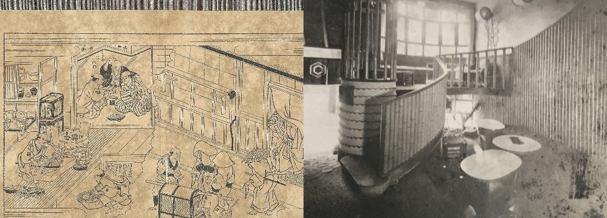 (写真左:江戸時代の外居 写真右:戦前の川喜田による店舗の様子)