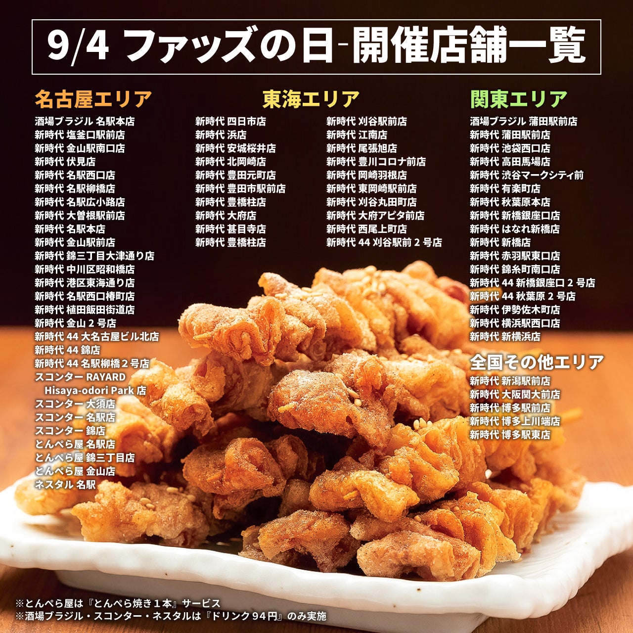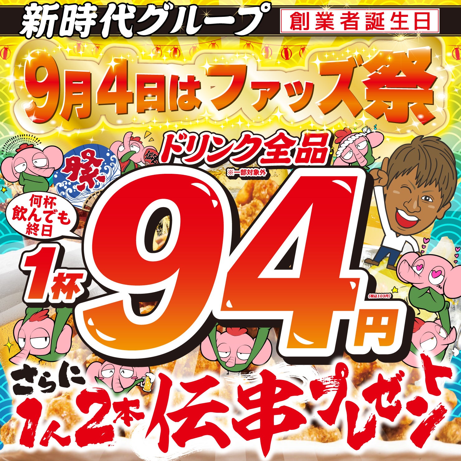 累計販売本数9,000万本の伝串が名物の「新時代」を中心に全国100店舗を展開する株式会社ファッズ(代表取締役:佐野直史)は、9月4日(日)に、ファッズ祭を開催させて頂きます。メインブランド『新時代』・姉妹ブランド『新時代44』では、ドリンク全品94円(税込103円)&名物の『伝串』をご来店者全員に2本プレゼントさせて頂きます。その他ブランド『酒場ブラジル・とんぺら屋・タイ料理スコンター・韓国料理ネスタル』においても全ドリンク94円(税込103円)を実施します。