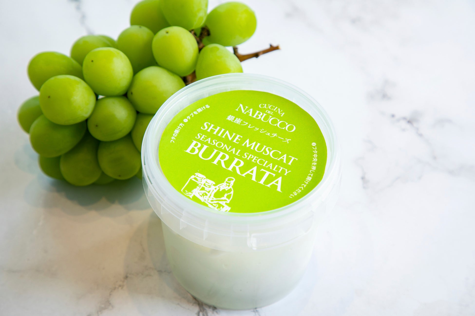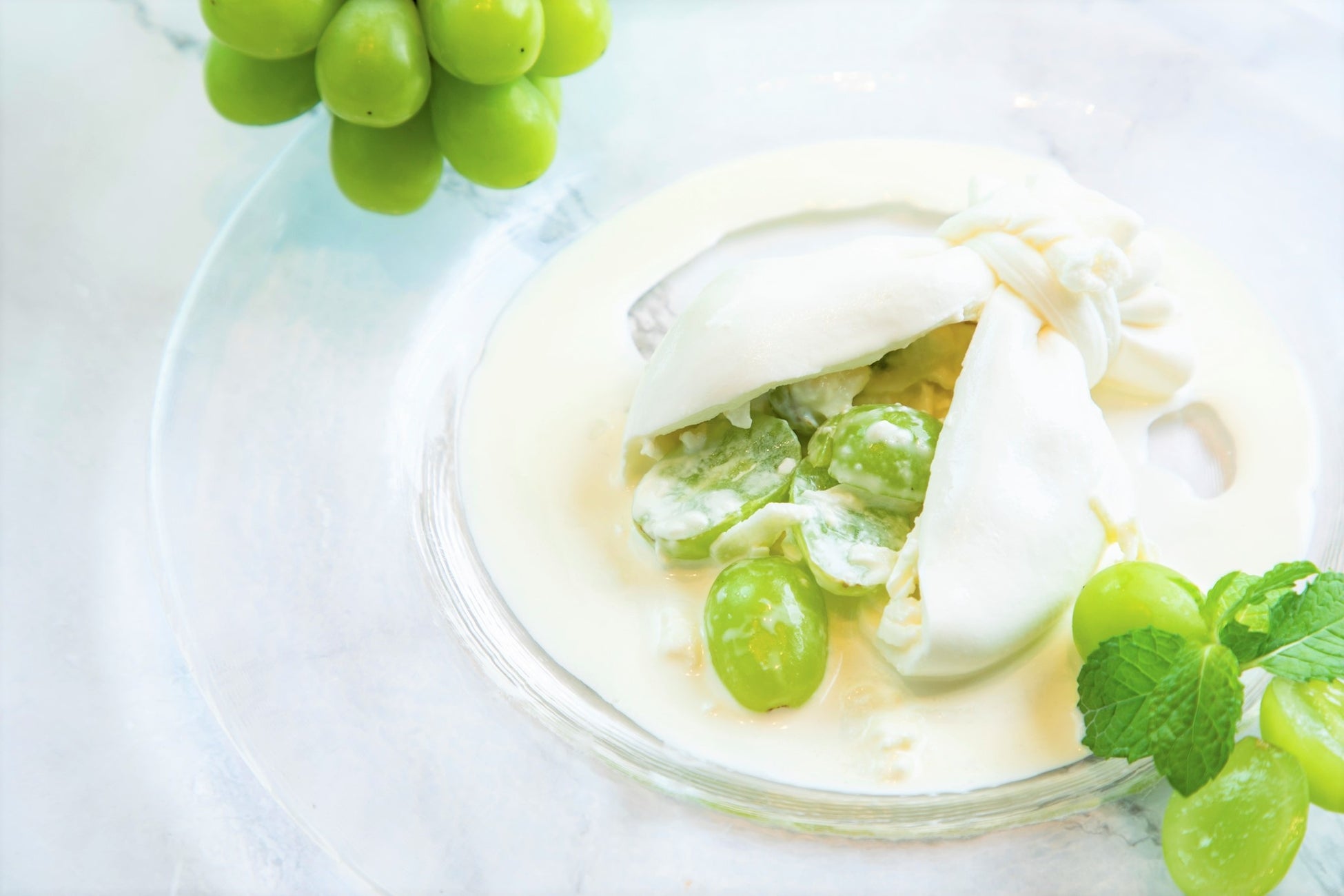 種なし、皮ごと食べられるパリッとした食感の大人気フルーツを、銀座cucina del NABUCCOのシグネチャーチーズでもあるブッラータチーズに優しく包み込みました。