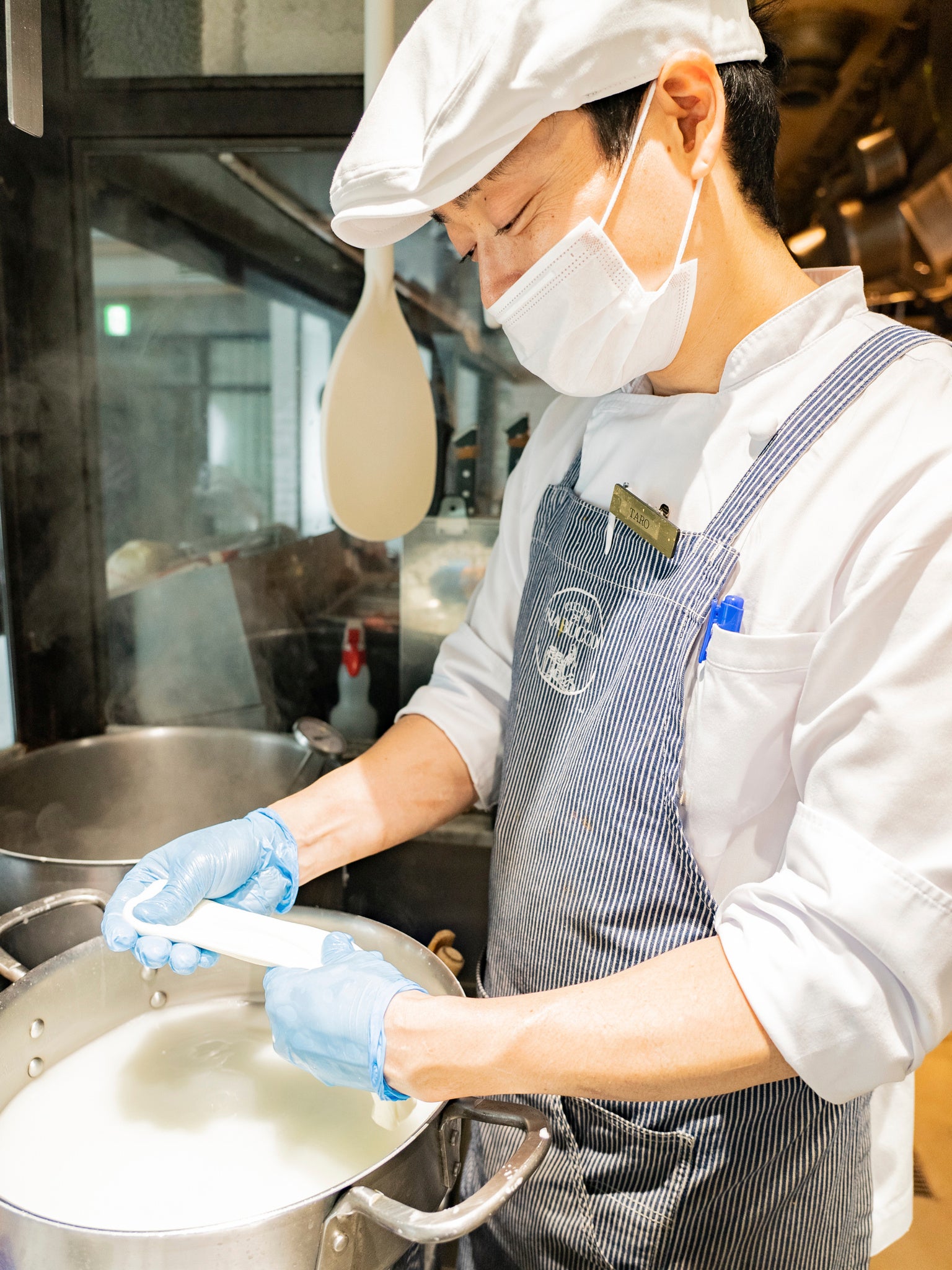岐阜は飛騨の豊かな自然の中で育った飛騨牛の新鮮な生乳を使用。おいしいチーズを作るために、日々、生乳の鮮度、温度管理を徹底し、“なるべく触らず、やさしく”扱い、チーズのなめらかさな味わいを追求しています。これがcucina del NABUCCOのチーズ作りのこだわりです。