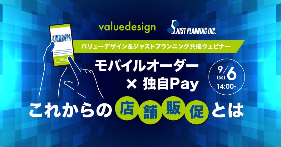 株式会社ジャストプランニング(本社:東京都大田区、代表取締役社長:酒井 敬、以下「ジャストプランニング」)は株式会社バリューデザイン(本社:東京都中央区、代表取締役社長:林 秀治、以下 バリューデザイン)と、無料のオンラインセミナー「モバイルオーダー×独自Pay これからの店舗販促とは」を2022年9月6日(火)に開催いたします。