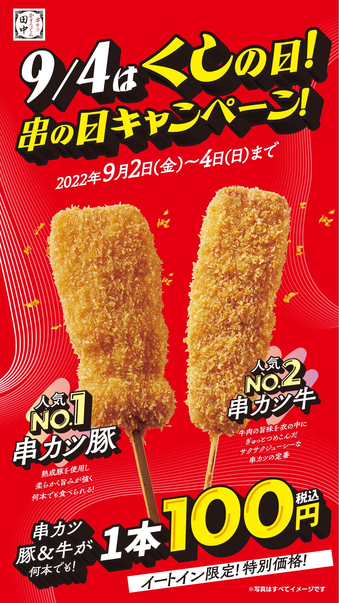 株式会社串カツ田中ホールディングス(本社:東京都品川区東五反田、代表取締役社長:坂本 壽男)は、2022年9月2日(金)~4日(日)の期間限定で、「9」と「4」の日にちにかけた「串(くし)の日キャンペーン」を実施いたします。串の日を記念し、人気串カツの「串カツ豚」と「串カツ牛」を思う存分味わっていただけるよう、100円(税込)で提供いたします。