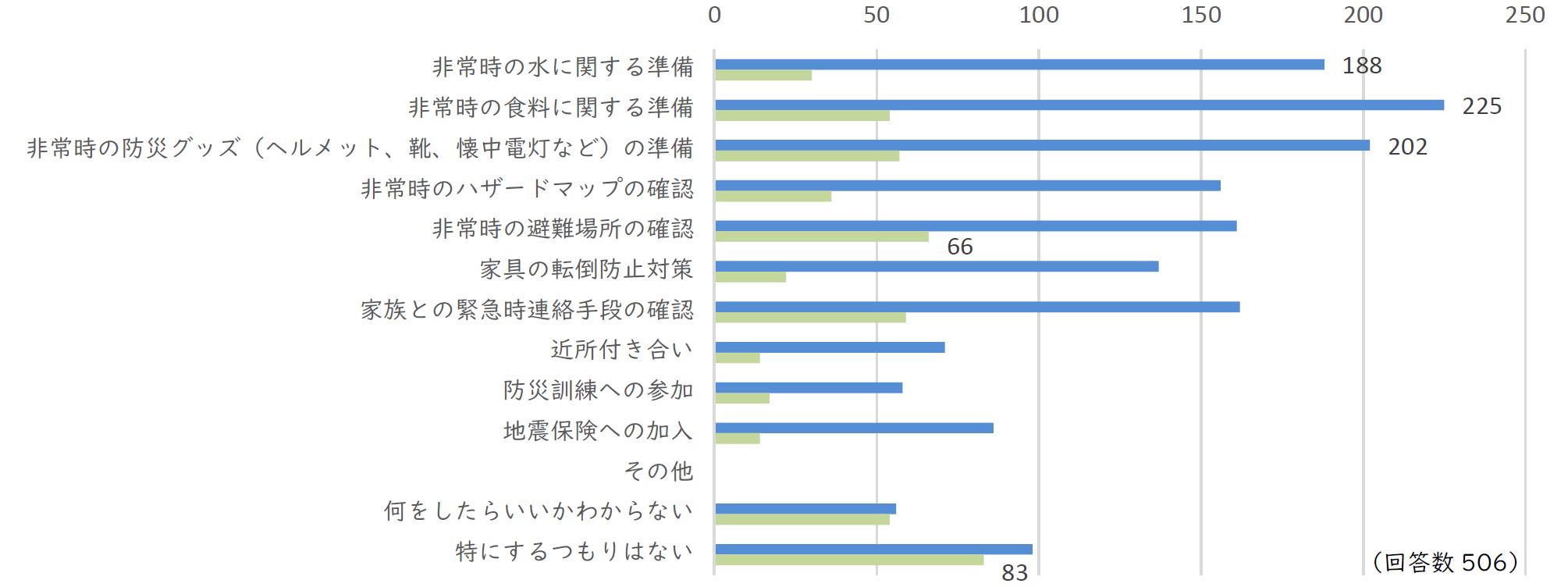 防災に対して大切だと思っている行動は、非常時の「食料」「防災グッズ」「水」というモノに関する回答が上位を占めました。しかし、「行動するとしたら何が一番大切だと思いますか?」という質問に対しては、「特にするつもりはない」が最多の回答となり、次いで「避難場所の確認」となりました。