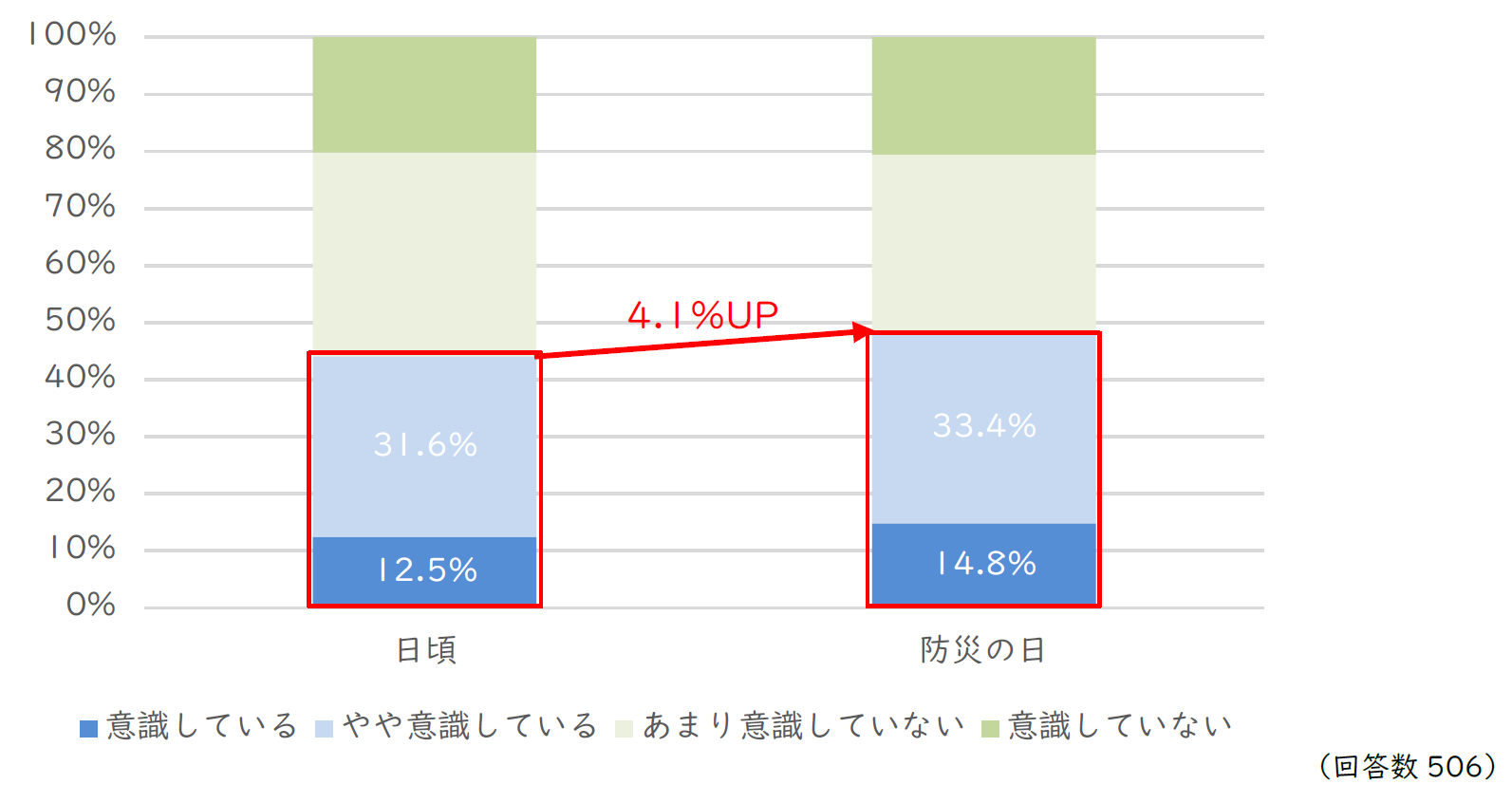 日頃からの防災意識について聞いたところ、少しでも意識していると回答した方は半数以下という結果に。一方で、防災の日や東日本大震災発生日である3/11など世の中で「防災」が話題になるきっかけがあれば防災意識は高まる(4.1%UP)ようです。若年層に対して、様々な場面で防災を意識するきっかけを提供していくことが必要なのかもしれません。