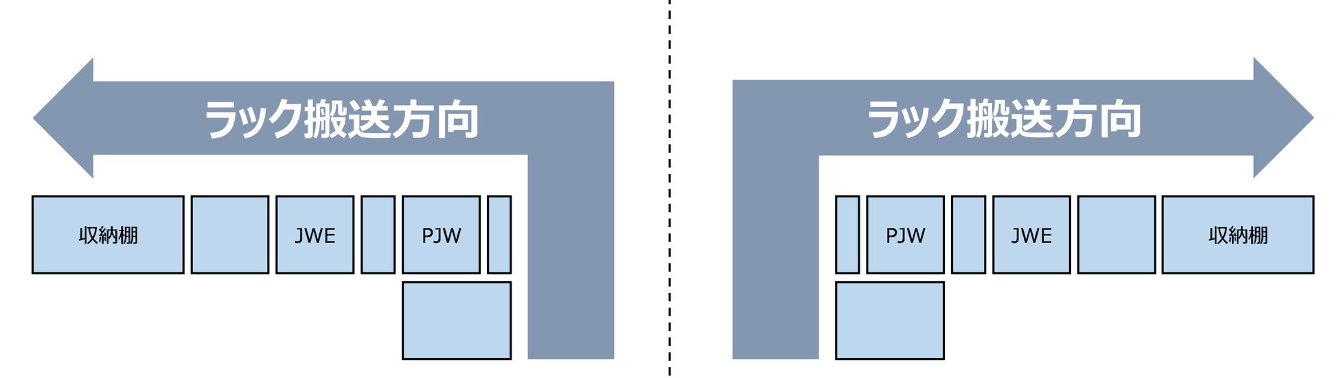予備洗い洗浄機(プレジェットウォッシャー)をコーナーに設置するL形設置。ラック搬送向きは左右に対応いたします。
