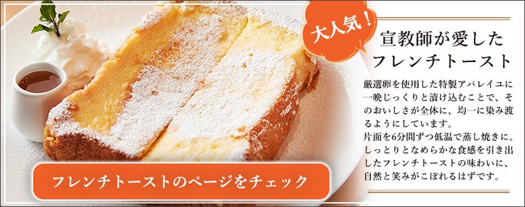 メディアにも頻繁に取り上げられ、リピーターが後を絶えない人気No.1の絶品メニュー「宣教師が愛したフレンチトースト」ぜひ一度ご賞味ください!