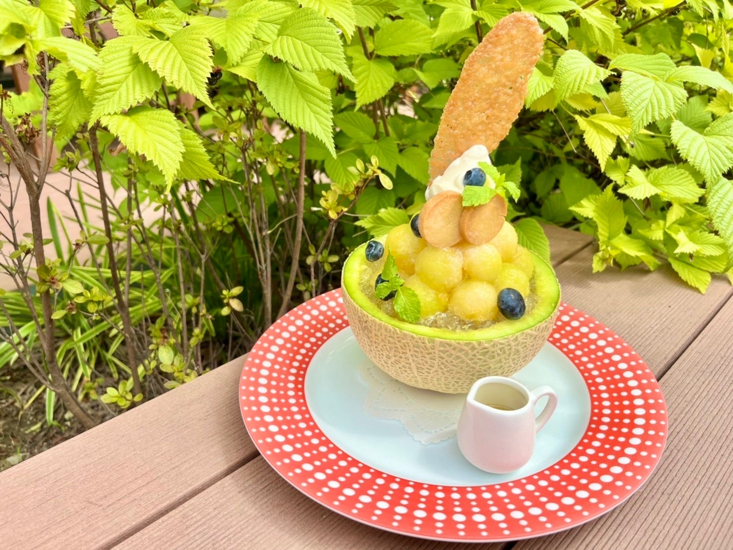 メロンを贅沢に1/2個使い、爽やかな白ワインゼリーとメロンのソースで清涼感のあるパフェに仕立てました!