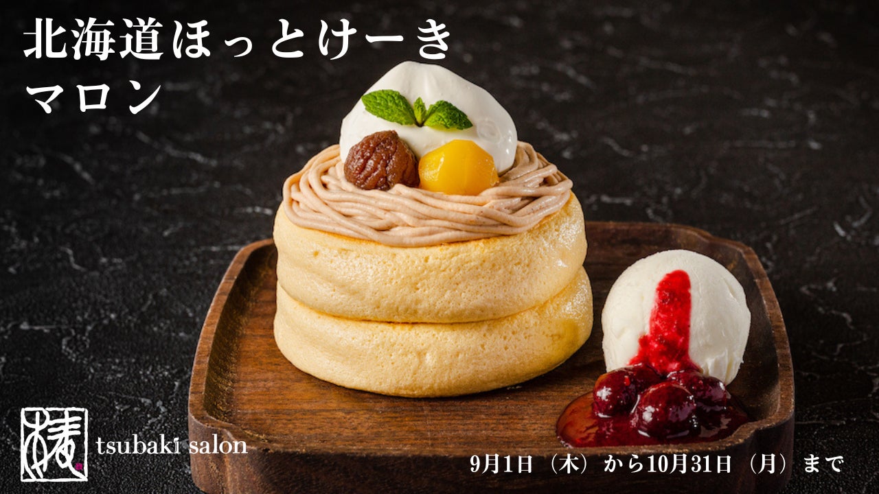 今回期間限定商品となる「北海道ほっとけーき マロン」は、椿サロン毎年恒例、秋の大人気商品です。無添加ぷるぷるほっとけーきに乗せた濃厚なマロンペーストに栗の渋皮煮と甘露煮、北海道ミルクを使用した濃厚ながら後味さっぱりの生クリーム。秋の味覚が口いっぱいに広がります。
