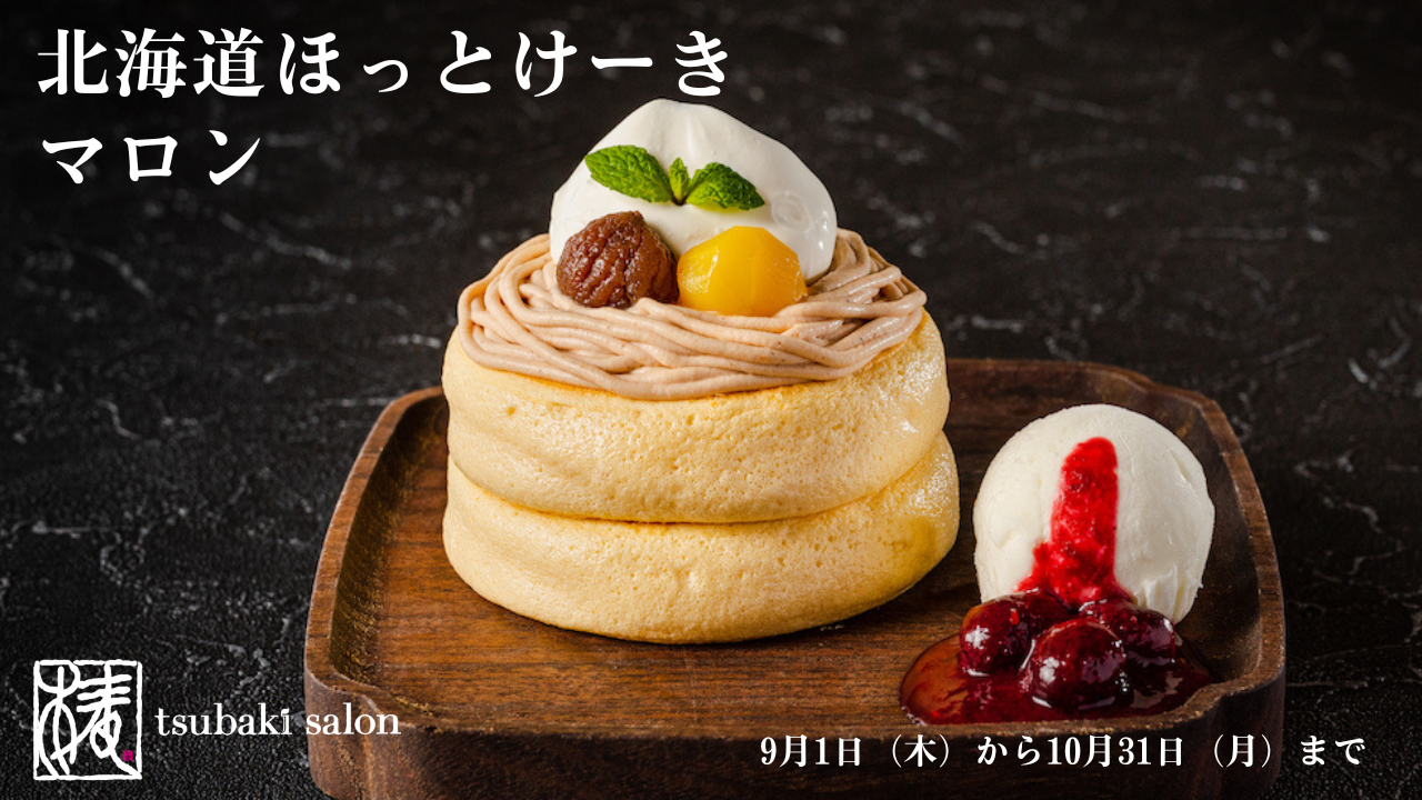 今回期間限定商品となる「北海道ほっとけーき マロン」は、椿サロン毎年恒例、秋の大人気商品です。無添加ぷるぷるほっとけーきに乗せた濃厚なマロンペーストに栗の渋皮煮と甘露煮、北海道ミルクを使用した濃厚ながら後味さっぱりの生クリーム。秋の味覚が口いっぱいに広がります。