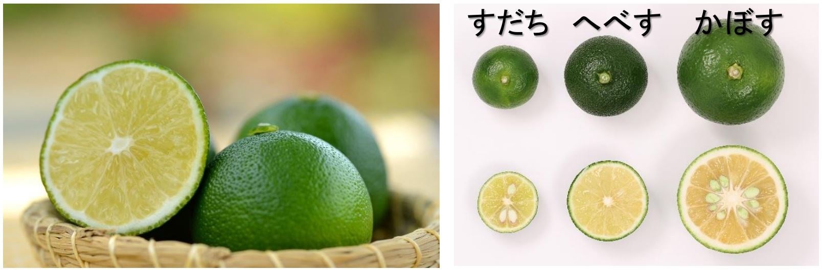 宮崎県北部にある日向市特産の柑橘類で、さわやかな香りとまろやかな酸味が特徴です。収穫時期は、8月中旬~10月上旬(露地もの)、さらに11月からは完熟へべすが楽しめます。かぼすやすだちと見た目が似ていますが、種が少なく、果皮が薄く、さらに果汁が豊富という特徴を持っており様々な料理に合うことから「クセがないのに”くせ”になる」柑橘として地元、宮崎県で愛されています。