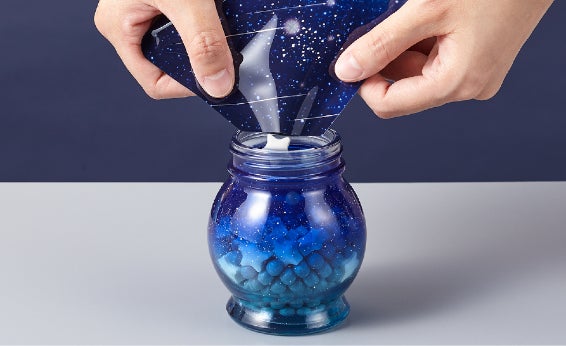 手元に夜空があるような世界観と、しゅんわりと消えるラムネの甘さが癒しを与えてくれます。また、瓶の中にソーダを入れるなどのアレンジをすれば、SNS映え間違いなしの写真撮影も楽しめます。疲れた心を癒したいときや、ほっと一息つきたいときなどに、エモーショナルな世界観に包まれて、リラックスするひと時をお楽しみください。