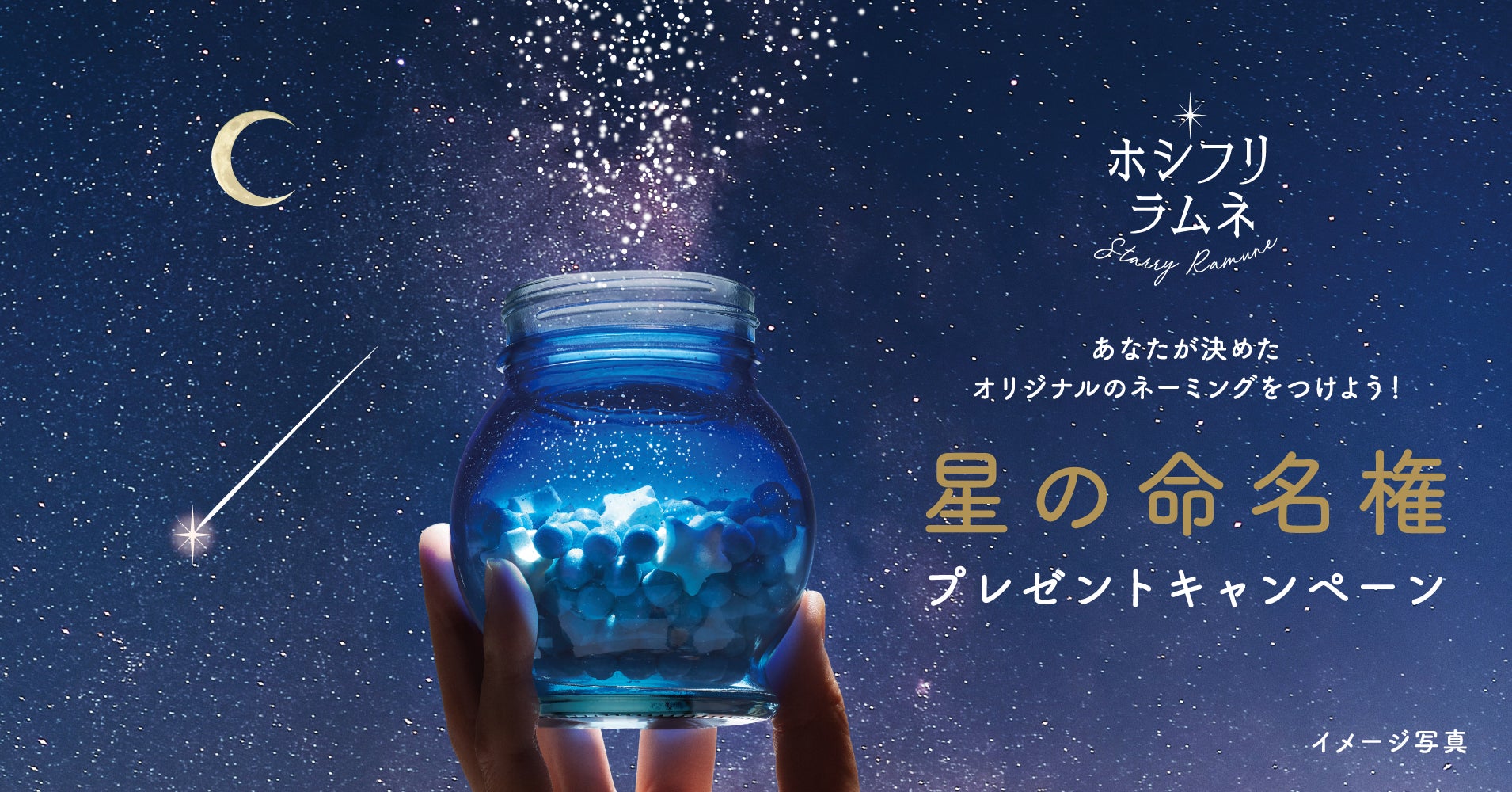 ホシフリラムネBOXセットの発売を記念して、各回1名様に星の命名権が当たる「ホシフリラムネ 星の命名権プレゼントキャンペーン」を実施します。ホシフリラムネが表現するエモーショナルな世界観を、さらにお楽しみ頂ける特別な体験をコンセプトにしたキャンペーンを開催します。夜空に煌めく星に、あなたが決めたオリジナルのネーミングをつけましょう。