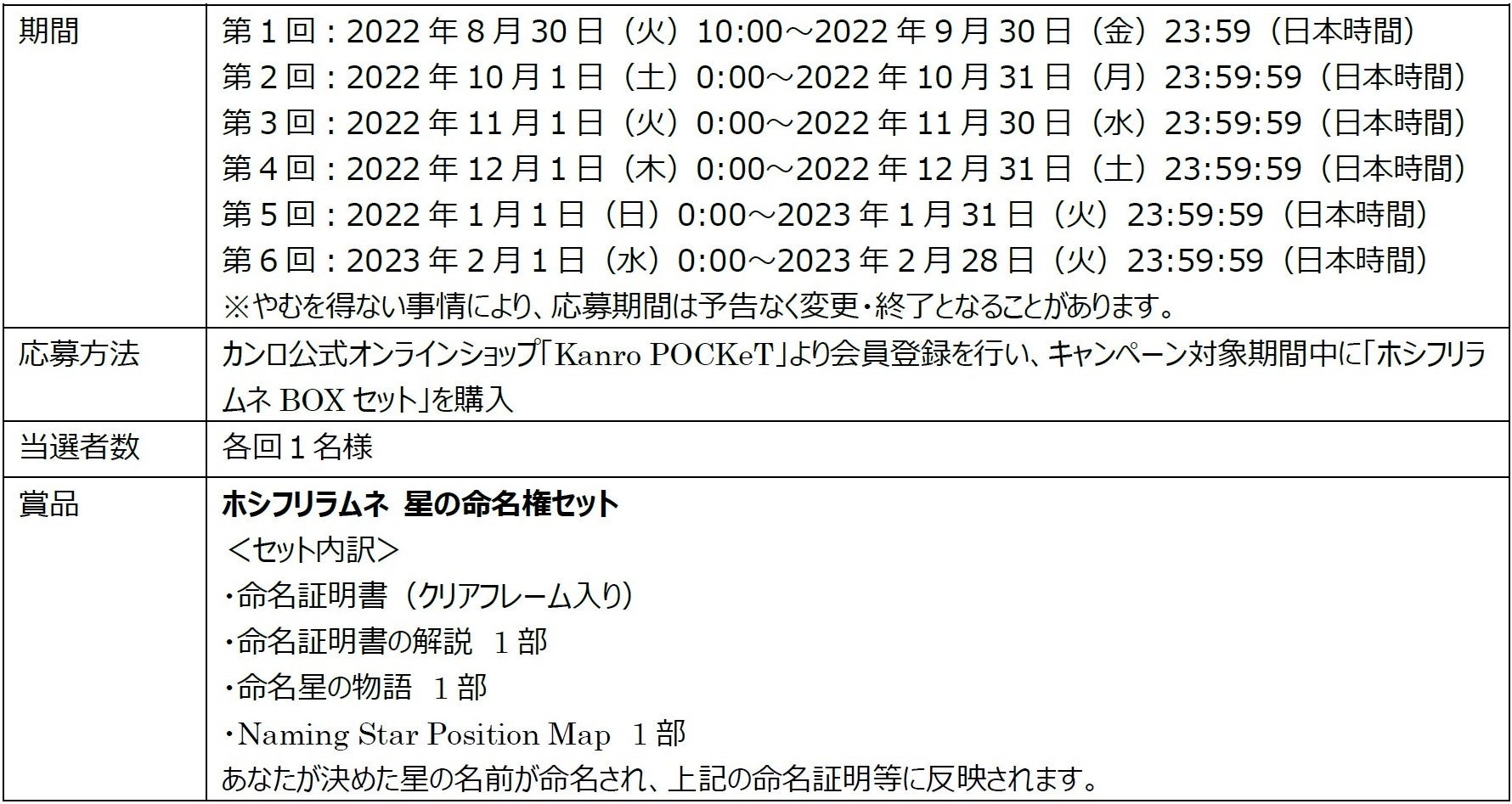 カンロ飴やピュレグミなどでおなじみのカンロ株式会社(本社:東京都新宿区、代表取締役社長 三須 和泰、以下 カンロ)は、2022年8月30日(火)より、満天の星空を手元に閉じ込めたような幻想的な体験ができるラムネ「ホシフリラムネ」をカンロオンラインショップ「Kanro POCKeT(カンロポケット)」にて限定発売します。また、”星の命名権”が当たるキャンペーンも実施します。