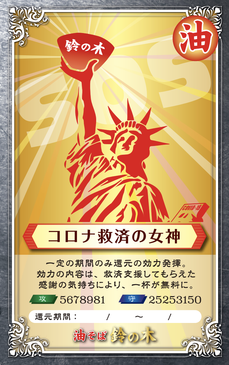 期間内、来店して下さった方には「コロナ救済の女神カード」を配布します。