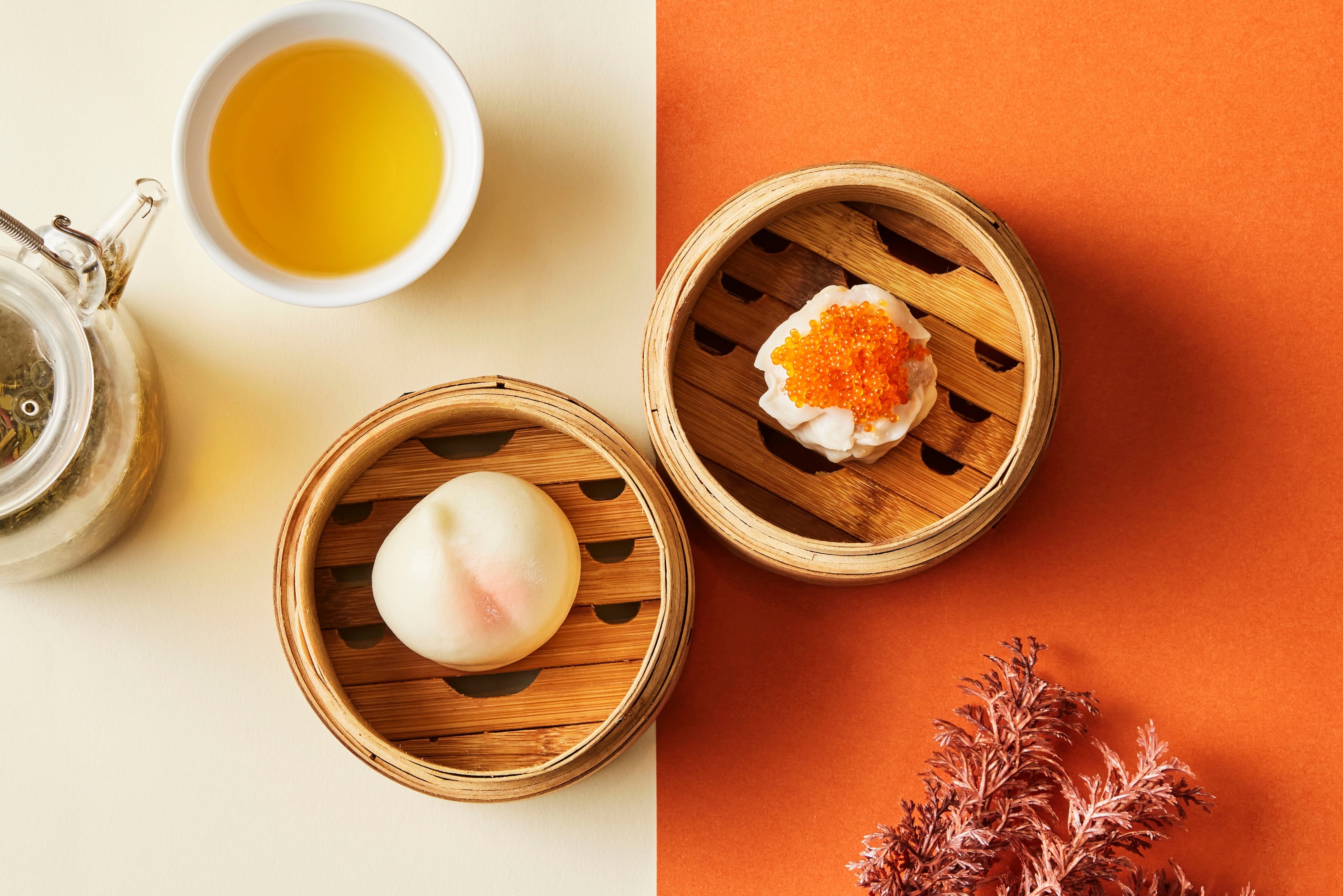 - 定番人気のオレンジ色のとびっこが華やかさを演出する焼売と可愛らしい蒸したての桃饅頭