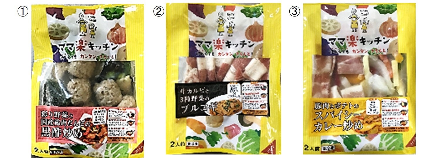 品名:①彩り野菜と国産鶏肉だんごの黒酢炒め 300g ②牛カルビと3種野菜のプルコギ 270g ③豚肉とポテトのスパイシーカレー炒め 300g