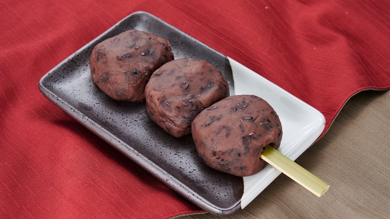 おはぎ3個を串に通した食べやすいワンハンドおはぎです。