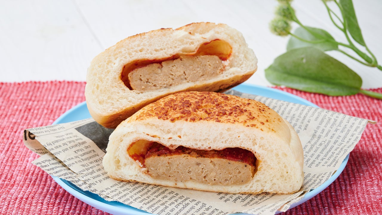 ハンバーグをケチャップとともにパンに包み、上面にチーズパウダーをトッピングしました。