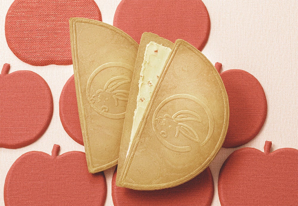 「鎌倉りんご半月」は、鎌倉五郎こだわりのパリンと香ばしい特製ゴーフレットに、甘酸っぱいりんご風味のクリームをたっぷりとサンドしています。さらに、クリームの中につぶつぶのりんごゼリーを忍ばせることで、もぎたてりんごのようなジューシーな食感を目指しました。
