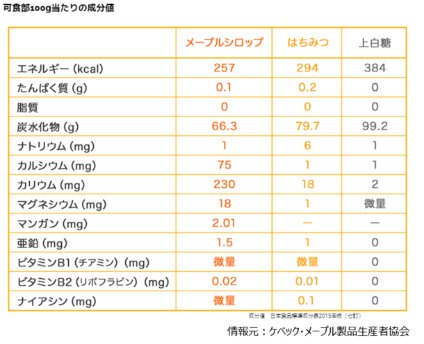 メープルシロップ栄養価比較表(100gあたり)