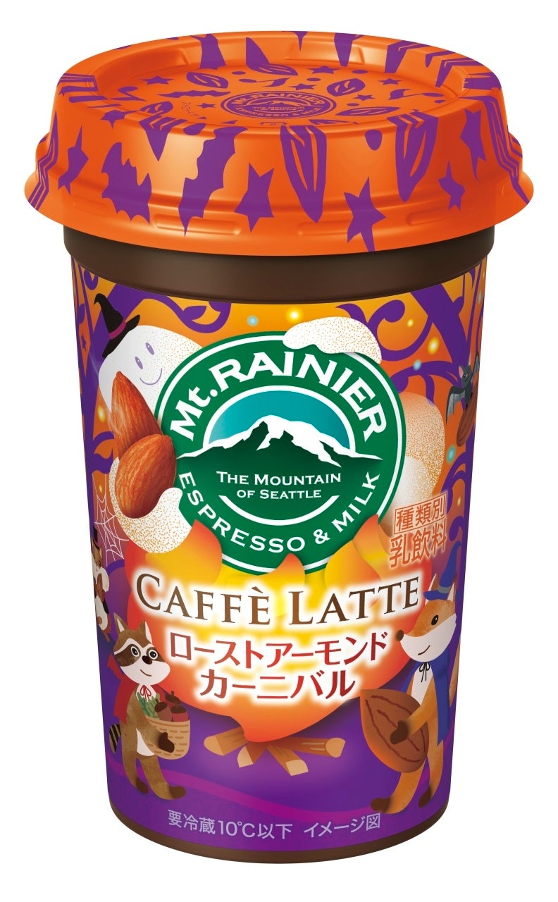 「マウントレーニア カフェラッテ ローストアーモンドカーニバル」は、エスプレッソにコクのあるミルクをブレンドしたカフェラテに、香ばしいローストアーモンド風味を加えた秋限定のフレーバーコーヒーです。パッケージでは、仮装した動物たちが秋の収穫を祝う賑やかなカーニバルシーンを表現しています。