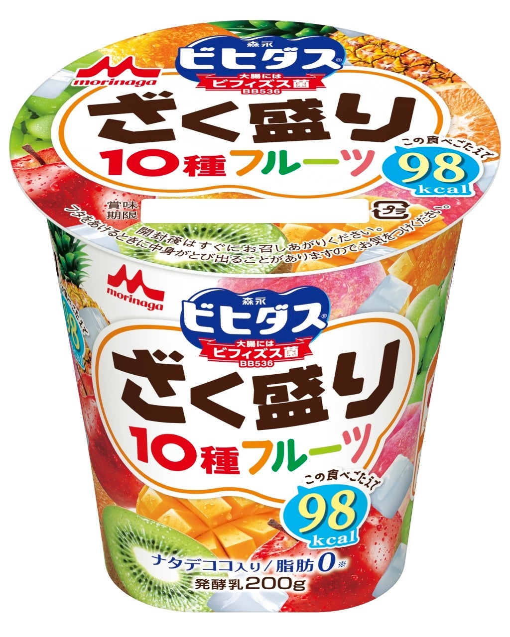 「ビヒダスヨーグルト ざく盛りフルーツ」は、りんごや白桃など10種類のフルーツ入りヨーグルトです。大き目にカットしたたっぷりのフルーツ果肉と果汁、コリコリとしたナタデココの食感や味わいを存分にお楽しみいただけます。200gと満足な食べごたえでありながら、ヘルシーな脂肪ゼロタイプのヨーグルトでカロリーはわずか98kcalです。脂肪分やカロリーが気になる方も気軽にお召しあがりいただけます。