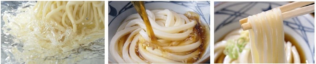 「おいしいうどん」は、徹底的に鮮度にこだわりぬいた「生きている」状態で提供されて初めて実現できる、と丸亀製麺は信じています。丸亀製麺がお届けするうどんは、国内 800 を超えるすべての店で一軒、一軒、手間を惜しまず、毎日、100%国産の小麦粉から打っています。打ち立てのうどんにこだわり、その場で切って、茹でて、作りたてをお客さまに提供しているからこそ、もちもちでおいしい独自の“丸亀食感”をお届けできています。