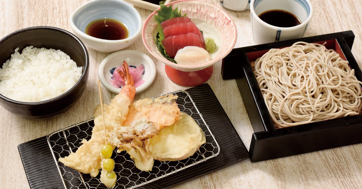 『秋の天麩羅そば御膳』 旬の秋鮭・舞茸・銀杏・さつま芋と海老天の盛合せに、お刺身が付いたお楽しみ御膳です。 |