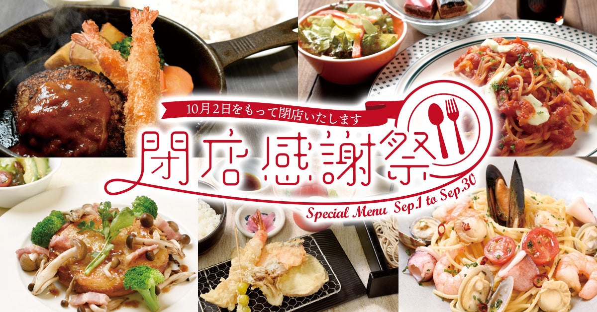 長年のご愛顧に感謝を込め、各店舗9月1日(木)~30日(金)の期間限定で特別メニューを販売いたします。従業員一同、最後まで元気に営業いたしますので、是非ご利用くださいませ。