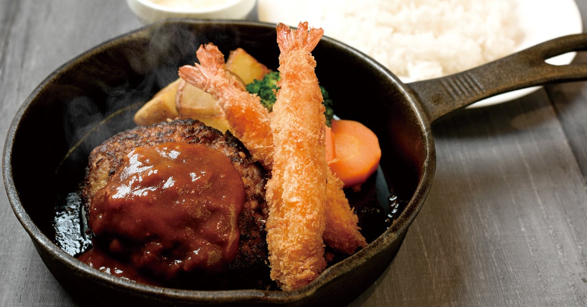『ハンバーグ&エビフライ』 自慢のハンバーグにエビフライを添えた、洋食王道の組み合わせです。 |