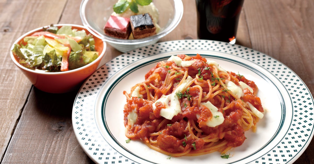 『モッツアレラチーズのトマトソーススパゲティセット(デザート・サラダ・ドリンク付き)』 人気のスパゲティにデザート・サラダ・ドリンクが付いた感謝セットです。 |