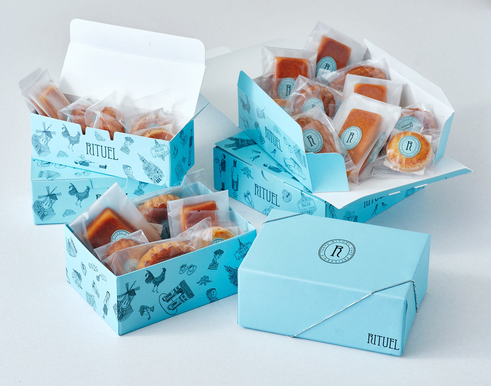 焼き菓子をお好みでお選びいただき、パリの青空をイメージした“RITUELブルー”のオリジナルボックスに詰め合わせたオリジナルアソートセットに仕上げてご提供します。また「RITUEL CAFÉ」を象徴するカットケーキから、キルシュの効いた大人のプチガトー「フォレノワール」のアトレ恵比寿限定フレーバー「フォレノワール ピスターシュ」も数量限定で登場します。