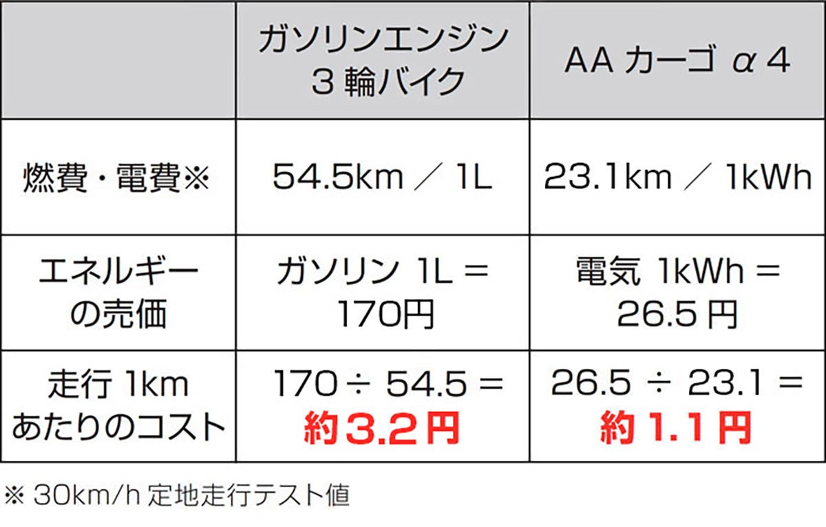 電気の力で走る電動バイクは、ガソリンエンジンバイクのように、ガソリンスタンドへ給油をしに行く必要はありません。さらに「AAカーゴ」の充電方法は、携帯電話のように充電ケーブルをつなぐだけ。車両を使用しない時間帯に駐車場で充電ができるため、業務開始時にはいつもフル充電で発車が可能で、無駄な人件費が省けます。