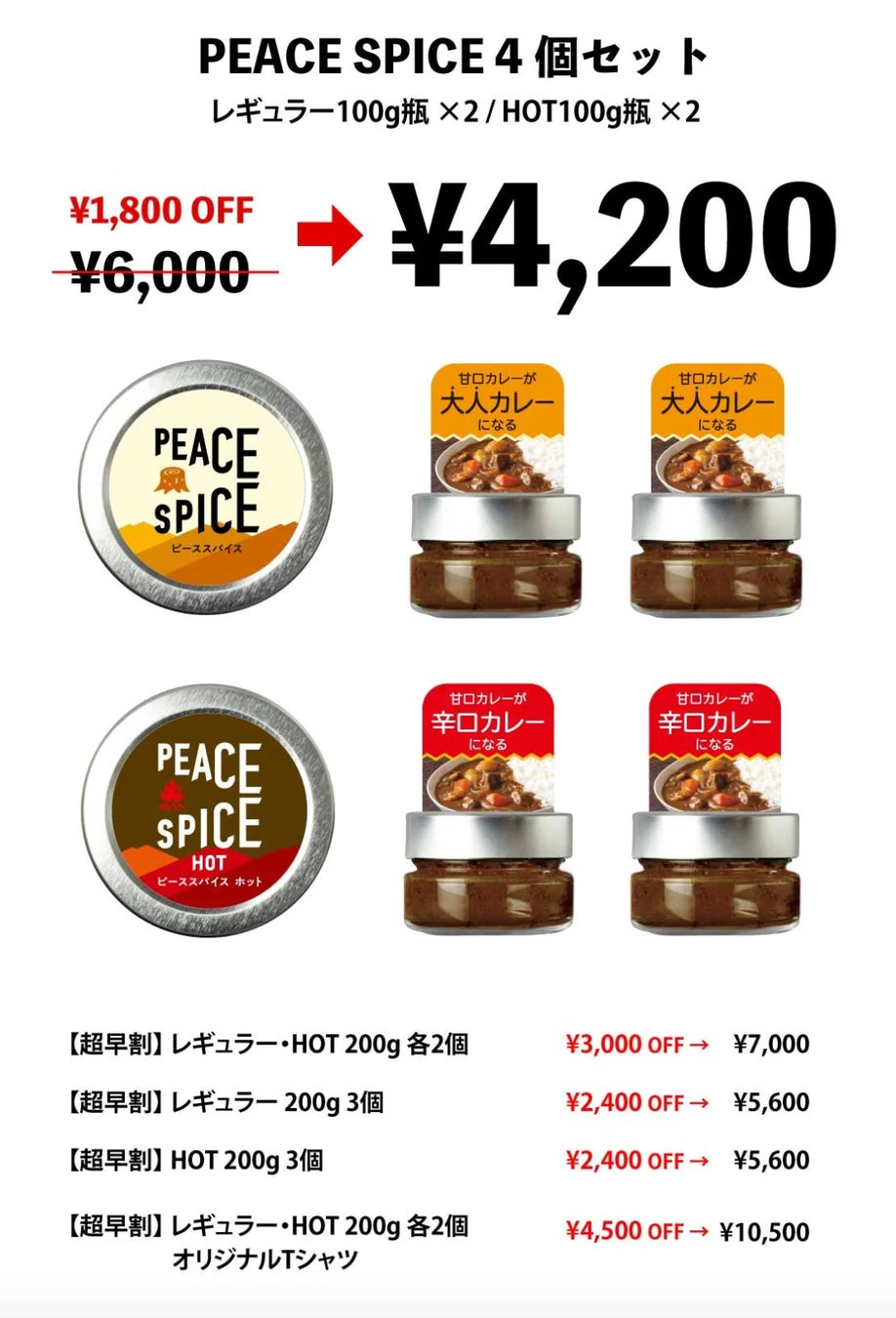 【早割】20%オフ レギュラー・HOT 200g 各2個ずつ+Tシャツ(¥12,000・送料税込)