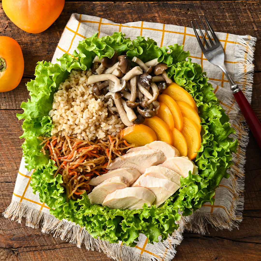 トッピング:きんぴらごぼう/玄米/塩麹しめじ/柿/蒸し鶏/ミックスリーフ