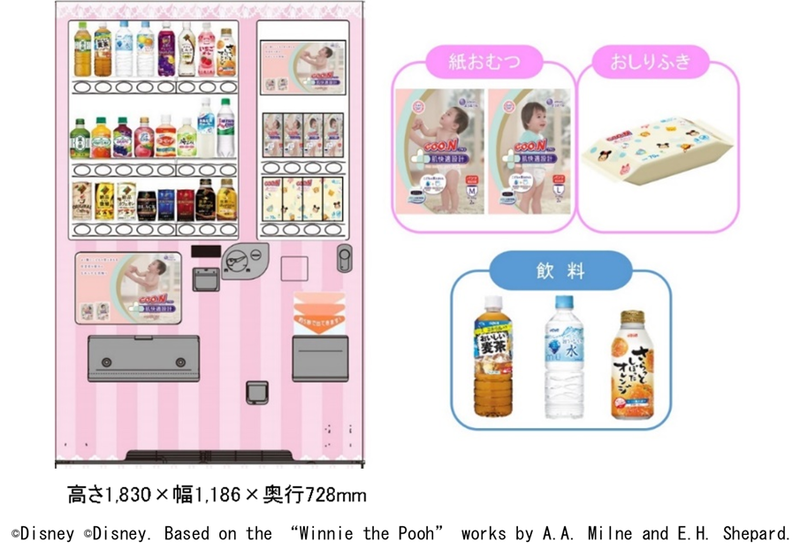 「ベビー用 紙おむつ自販機」は、飲料と紙おむつのコラボレーションを実現した自販機です。飲料は、ダイドードリンコのお茶・紅茶飲料、水、スポーツドリンク類、果実野菜飲料などを販売し、ベビー用 紙おむつは、大王製紙の「グーンプラス 肌快適設計 パンツ 2枚入り」(パンツタイプMサイズ、Lサイズ 各240円)「グーン 肌にやさしいおしりふき 70枚入り」(240円)を販売します。