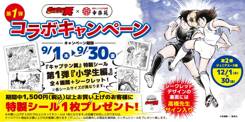 期間中、幸楽苑で1,500円(税込)以上ご注文いただいたお客様に、今でも語り継がれる『キャプテン翼』の名シーンが描かれた特製シールをプレゼントします。第1弾では「小学生編」、第2弾では「ジュニアユース編」、さらに作者の高橋先生のサインがプリントされたシークレットシールもありますのでお楽しみに。幸楽苑では、『キャプテン翼』と共にスポーツを愛する皆様を応援してまいります。皆様のご来店をお待ちしております。