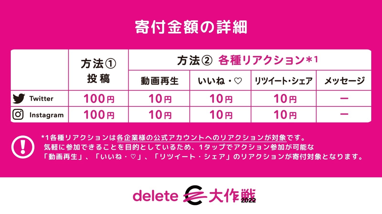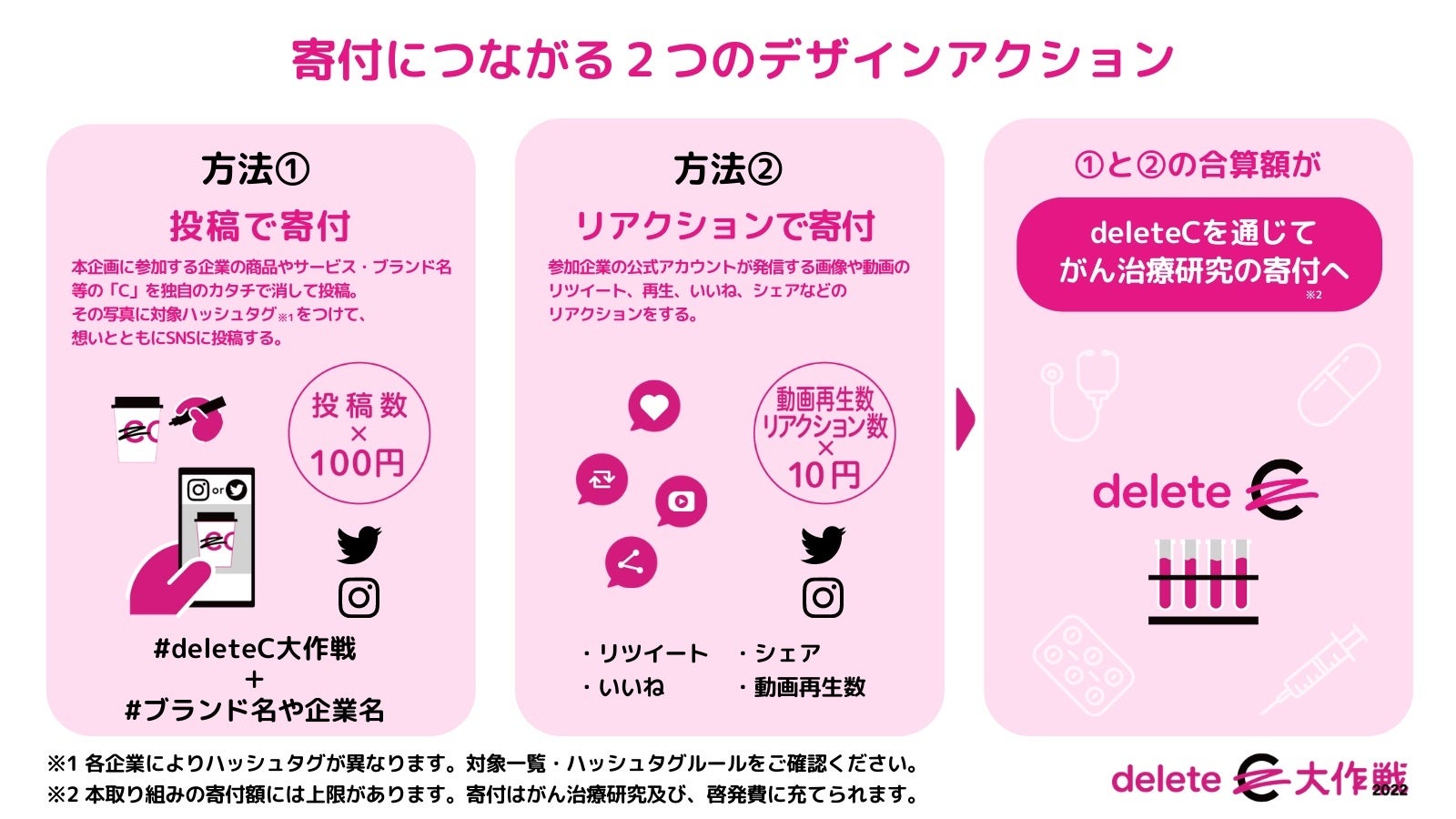 「#deleteC大作戦」とは、「あつまれ、想い」をスローガンに掲げ、賛同する企業のブランドの商品やロゴに関連する「C」の部分を自由なカタチで消した画像や動画を、「#deleteC大作戦」と「#がブリチキン」をつけて参加者がSNS(Twitter、Instagram)で投稿すると、1投稿あたり100円が、がん治療研究への寄付・啓発費用として参加企業からdeleteCに贈られます。また、参加者が、参加企業の公式アカウントが発信する画像や動画をリツイート/シェア/いいね/再生をすると、1リツイート/1シェア/いいね/1再生/あたり10円が、がん治療研究への寄付・啓発費用として、参加企業からdeleteCに贈られます。個人、企業、組織などの立場を越え、がんを治せる病気にしたい、という想いを自由に意思表示することで、誰もががん治療研究を応援できる仕組みをつくり、がん治療研究への寄付と啓発を通じて、1日でも早く「がんを治せる病気にする日」を手繰り寄せることに貢献します。(特定非営利活動法人deleteC プレスリリースより抜粋)