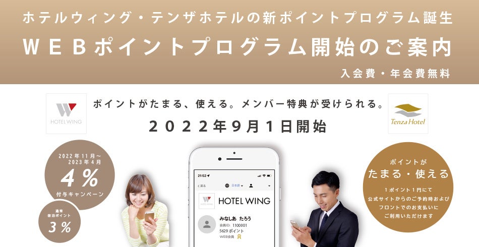 株式会社ミナシア(本社:東京都千代田区、代表取締役:下嶋一義)が運営するホテルウィングチェーンおよびテンザホテルは、2022年9月1日(木)より、WEBポイントプログラムを始動いたします。