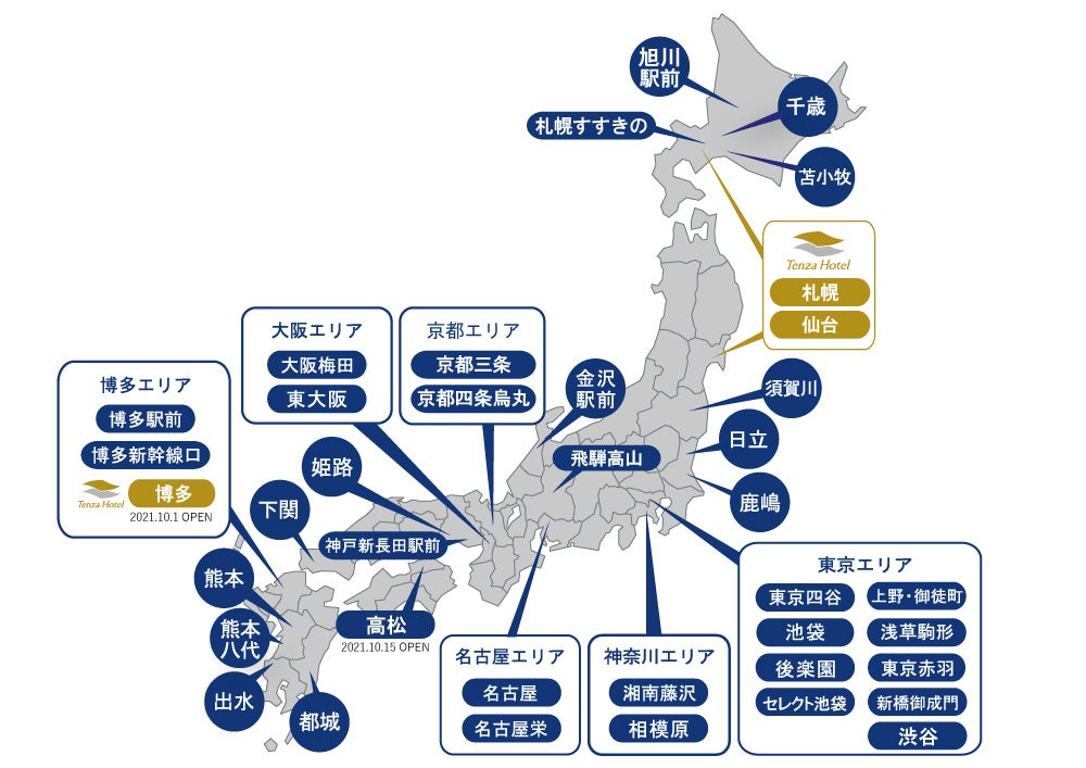 当社では、「ホテルウィングインターナショナル」、「ホテルウィングインターナショナルプレミアム」、「ホテルウィングインターナショナルセレクト」「テンザホテル」の4ブランドを展開し、現在39店舗/5,166室を運営しています。(2022年8月30日時点)